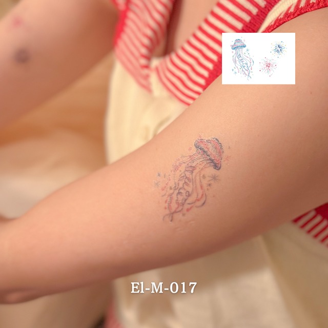 ひらひら漂うクラゲと星屑のような輝き。 幻想的なのに、どこか少女らしい純粋さを残したデザイン。 いつもの自分に、少しだけ夢見心地の魔法を。 シートサイズ: W105×H74mm -------------------------------------- その日に剥がすこともできますが、擦らないよう大切にお過ごしいただくと部位によっては3日~1週間ほど持続します。 説明書を同梱しております。使用方法についてよく読みご確認の上ご使用ください。