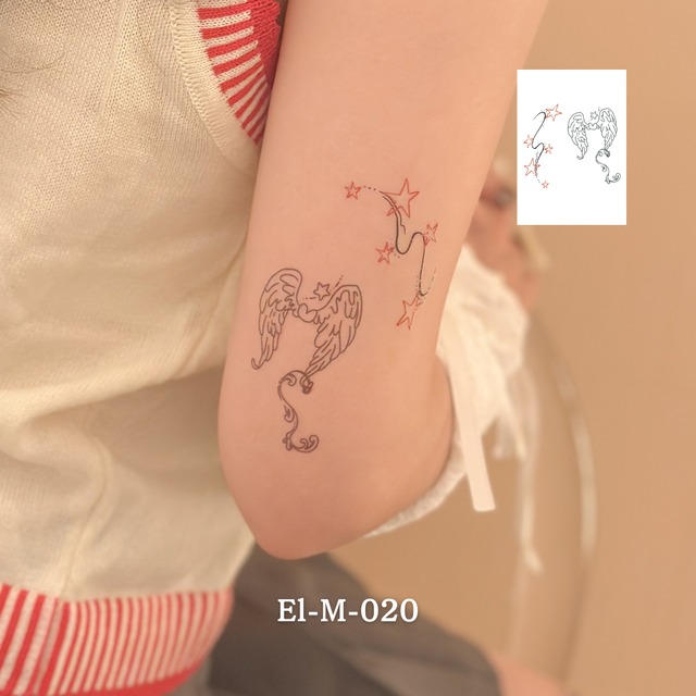 流れる星と天使の羽が、そっと背中を押してくれる。 きらめく光をまとったワンポイントは、気分をふわりと軽くしてくれます。 今日は少しだけ、自分を信じたい日に。 シートサイズ: W105×H74mm -------------------------------------- その日に剥がすこともできますが、擦らないよう大切にお過ごしいただくと部位によっては3日~1週間ほど持続します。 説明書を同梱しております。使用方法についてよく読みご確認の上ご使用ください。