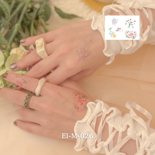 ふんわり描かれたお花と蝶々は、まるで絵本の端に添えられた挿絵みたい。 素肌の上でそっと物語を始めてくれる、優しいタッチの手描き感。 ナチュラル派にも、繊細なワンポイントを求める人にも。 シートサイズ: W105×H74mm -------------------------------------- その日に剥がすこともできますが、擦らないよう大切にお過ごしいただくと部位によっては3日~1週間ほど持続します。 説明書を同梱しております。使用方法についてよく読みご確認の上ご使用ください。