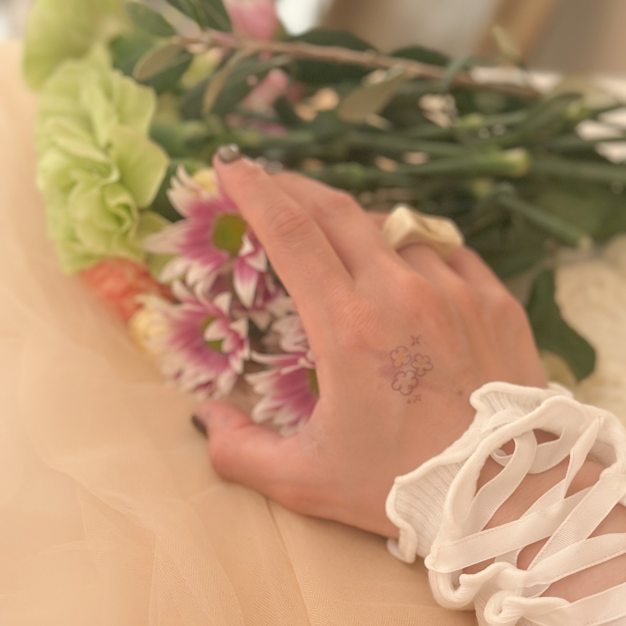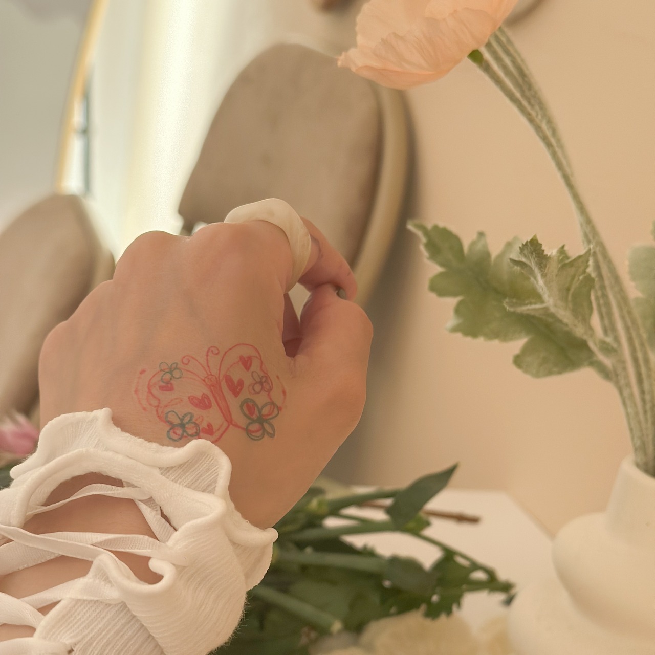 ゆるっと描かれたお花と蝶々が、素肌の上でふんわり微笑むようなデザイン。
