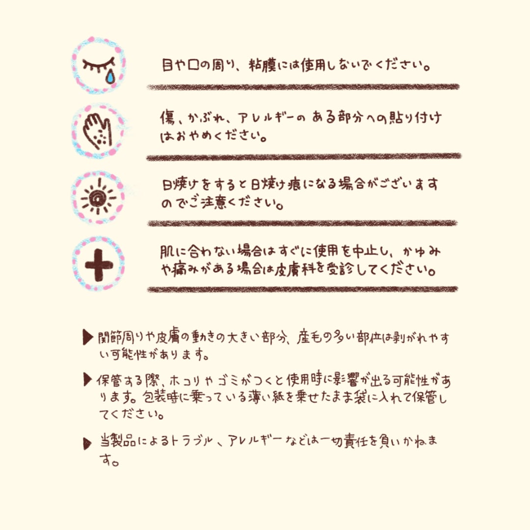 その日に剥がすこともできますが、擦らないよう大切にお過ごしいただくと部位によっては3日~1週間ほど持続します。