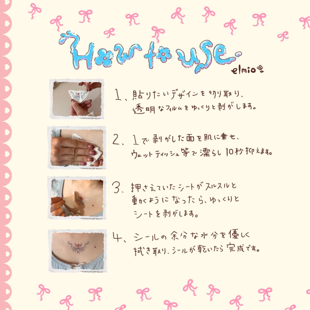 その日に剥がすこともできますが、擦らないよう大切にお過ごしいただくと部位によっては3日~1週間ほど持続します。
